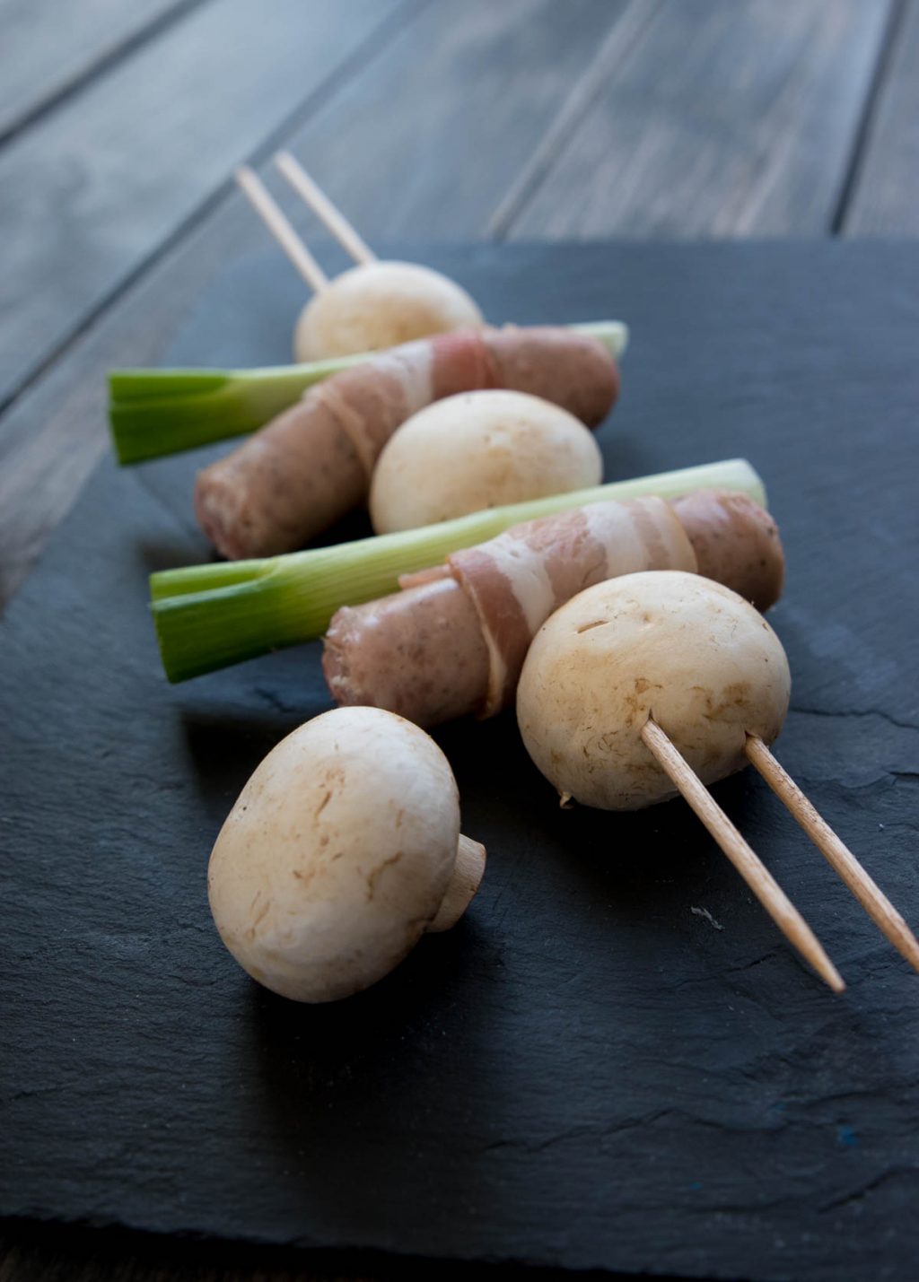 Kleine Snacks und Häppchen sind nicht nur super lecker sie sind vor allem super praktisch für jedes Partybuffet. Wurstspieße sind eine einfach und schnell umzusetzende Möglichkeit um für Spaß am Grill oder Lagerfeuer zu sorgen. Jetzt spießt du nach belieben abwechselnd Zwiebeln Zucchini Würstchen und Käse mit Bacon umwickelt auf die Grillspieße.